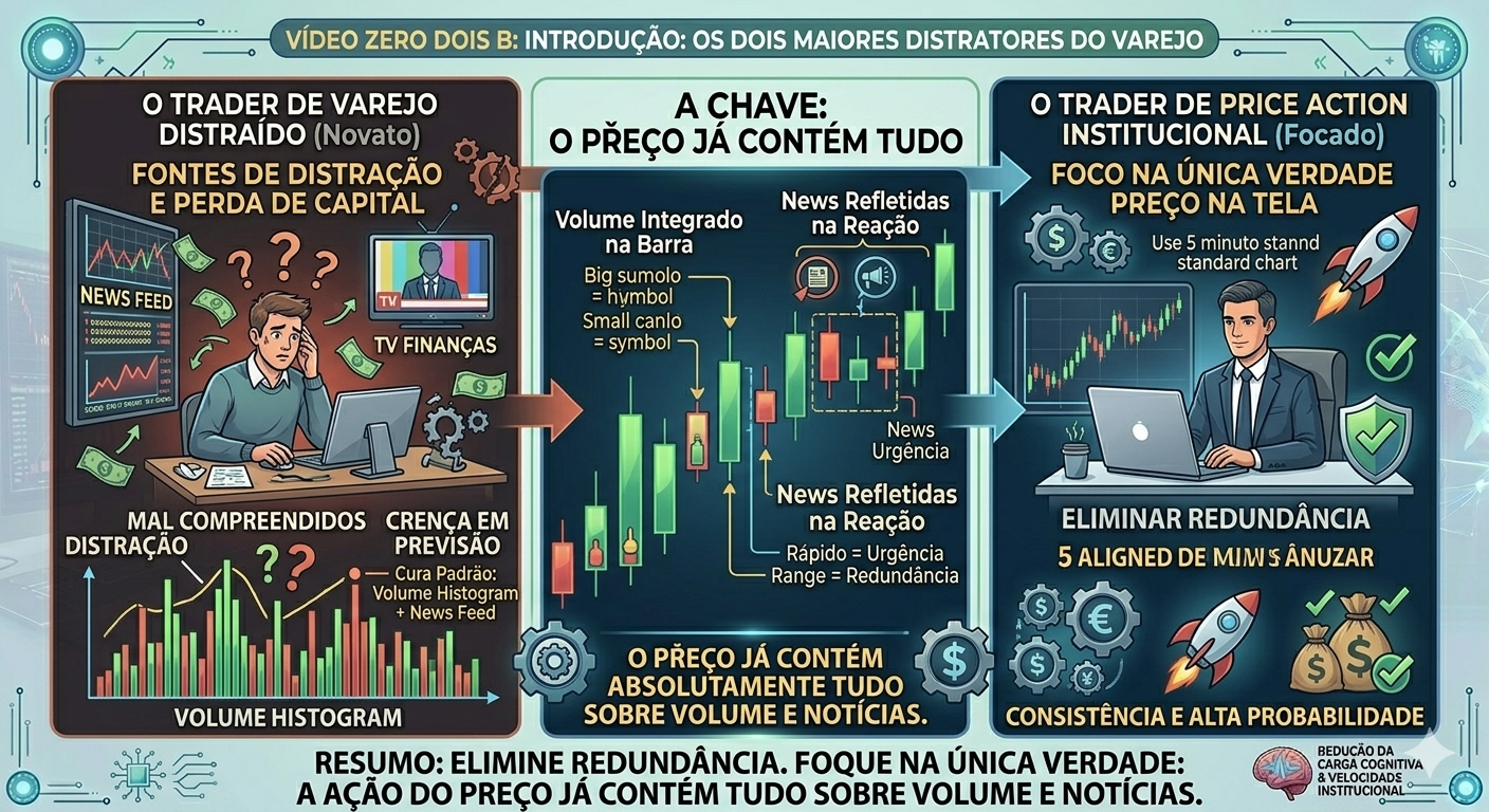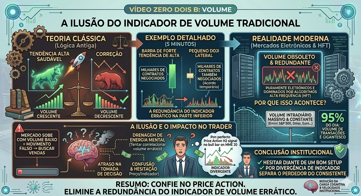 Qual é a postura recomendada pelo Price Action institucional em relação ao uso do indicador de volume tradicional e feeds de notícias na tela?