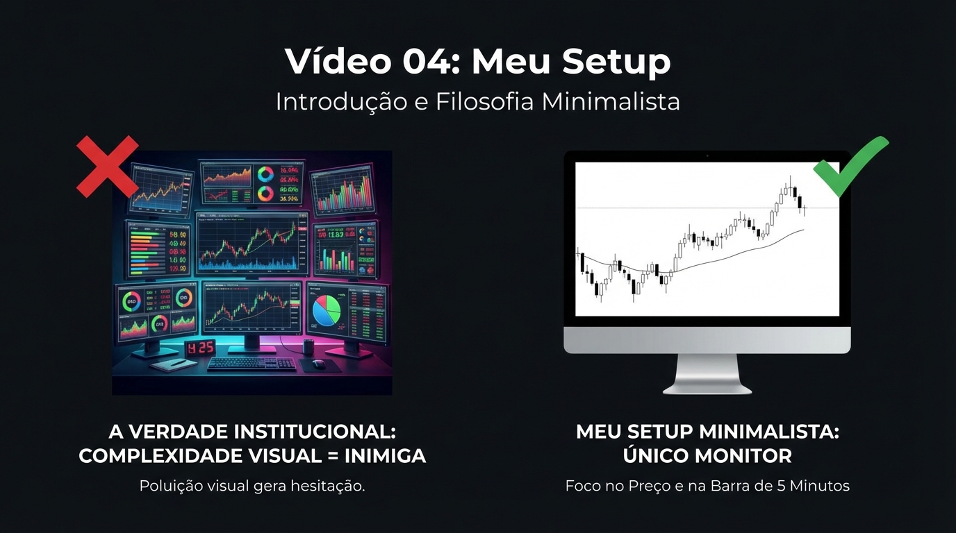 Segundo o vídeo, qual é o principal problema de o trader tentar replicar telas complexas cheias de múltiplos monitores e indicadores brilhantes?
